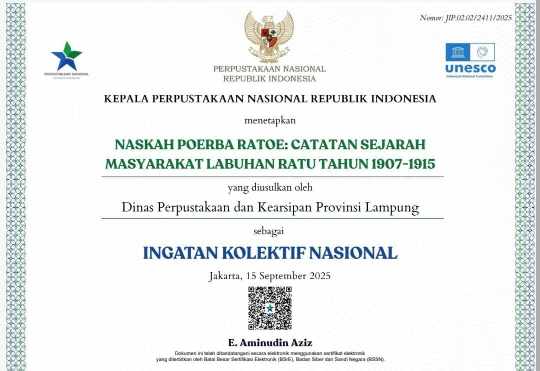 Penghargaan bergengsi tersebut diberikan sebagai bentuk pengakuan atas nilai sejarah, budaya, dan literasi yang terkandung dalam naskah-naskah kuno tersebut. Keberhasilan ini merupakan hasil dari usulan Dinas Perpustakaan dan Kearsipan Provinsi Lampung yang terus menunjukkan komitmennya dalam pelestarian warisan literasi dan budaya daerah.