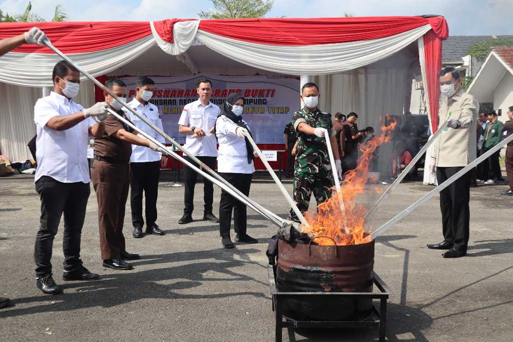 Secara seremonial Walikota Hj. Eva Dwiana bersama Kejari Bandar Lampung dan Forkopimda Bandar Lampung melakukan pemusnahan barang bukti dengan cara membelender dan membakar barang bukti hasil kejahatan tersebut.